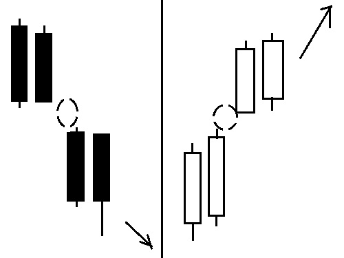窓開け後、陰線2本は売り。窓開け後、陽線2本は買い。