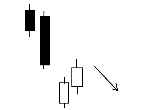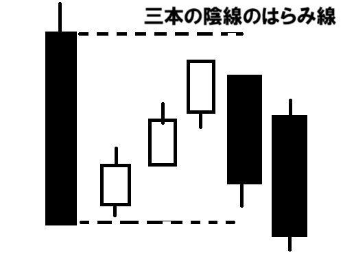 大きな陰線の後に、その陰線の本体の3等分ほどの小ぶりの陽線が連なり、
