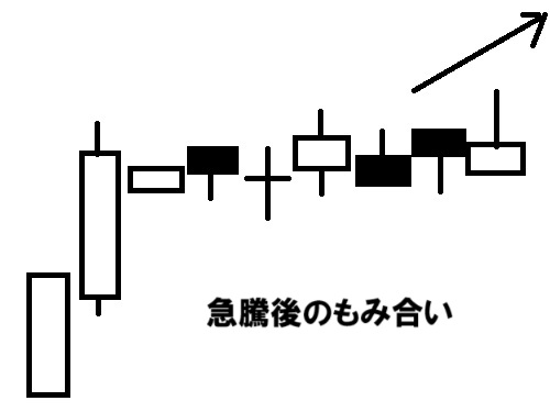 株価が暴騰したのち、本体が小さい陽線や陰線がもみ合い状態になります。