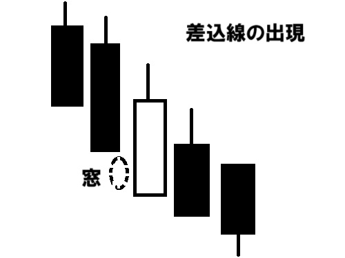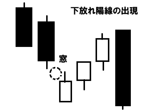 下落途中の陰線の後、窓を開け、