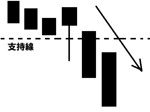 下放れするローソク足は、陰線です。支持線でいったん跳ね返されて